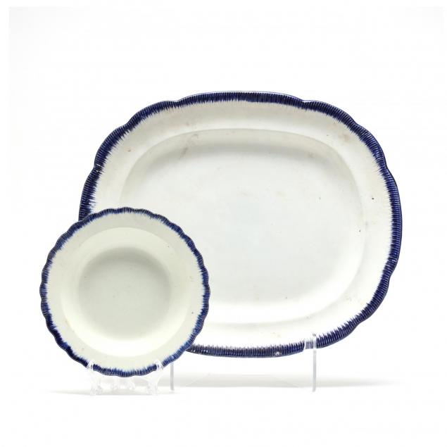 Early 19th century, including a large serving platter with shaped edge, with impressed mark reading Staffordshire Clews Ware and a low soup bowl with scalloped edge, unmarked.