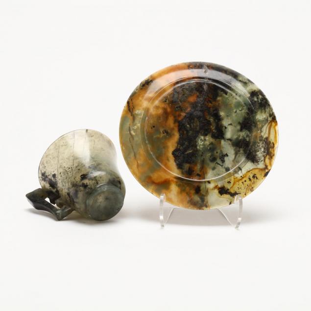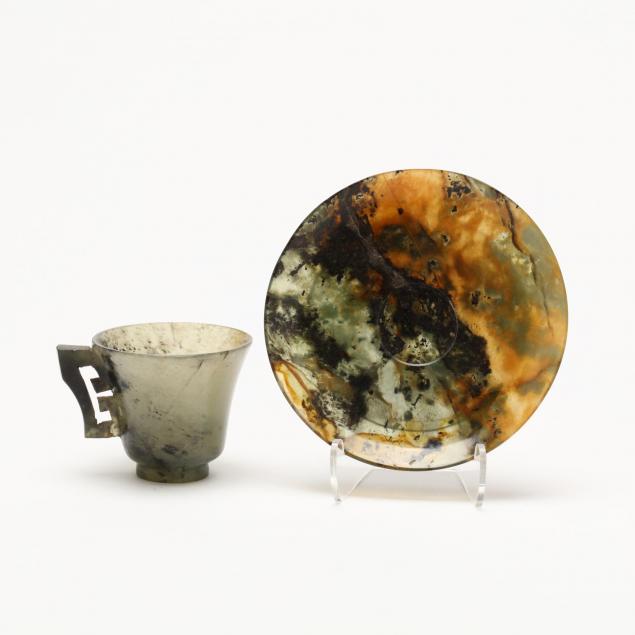 A small tea cup with decorative carved handle, comes together with a saucer.