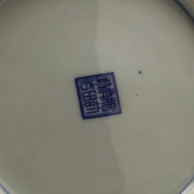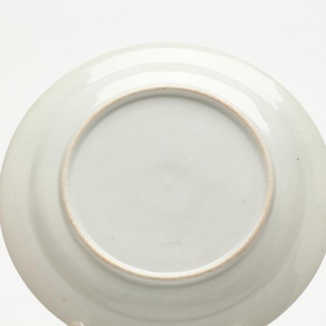 Antique, a pair of matching hand painted imari plates with a central medallion containing pine, plum, and bamboo, symbols of longevity and good fortune in Asian culture, with impressed seal to underside of each plate, and a lobed plate hand painted with art deco style flowers and two fanciful phoenixes, with a cobalt blue mark to the underside of the plate.