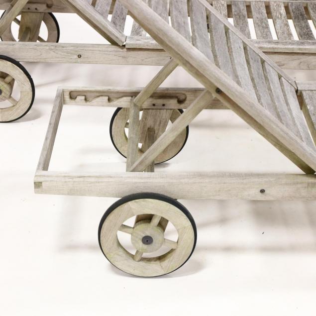 Contemporary, rectangular slatted teak form, hinged adjustable back with wheels to one end, labeled.
