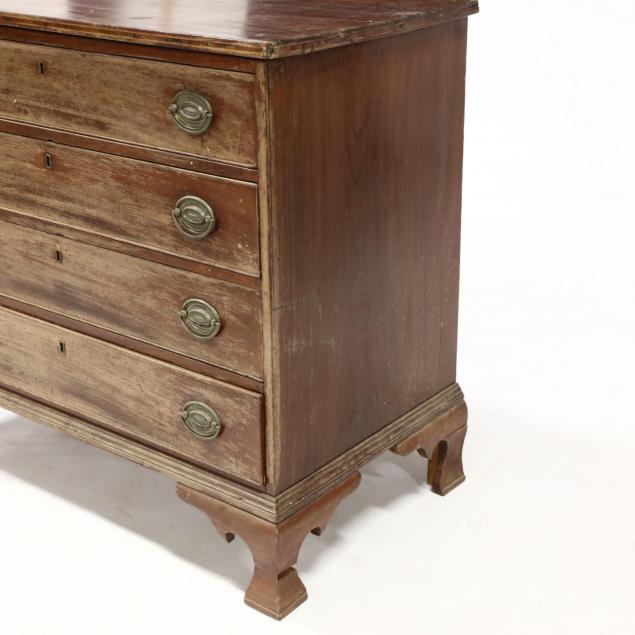 Circa 1800, mahogany, white pine secondary, rectangular form, top with double line inlay to edge, four cock beaded drawers with ogee bracket foot base.
