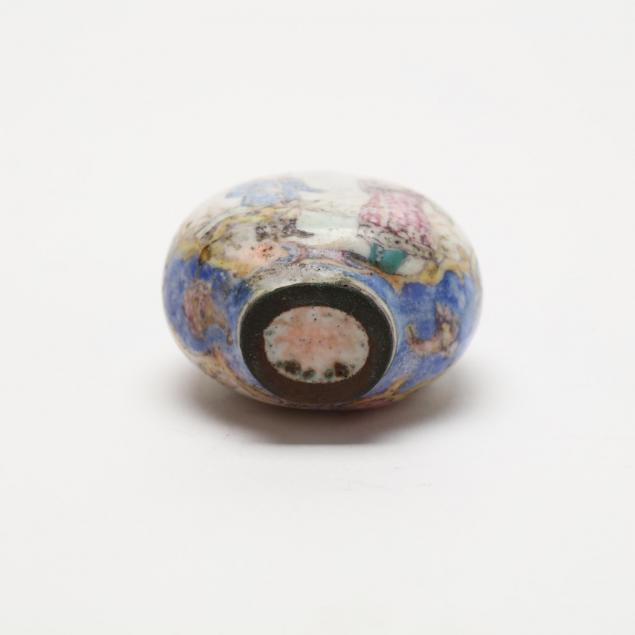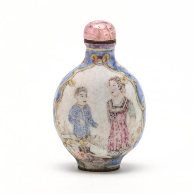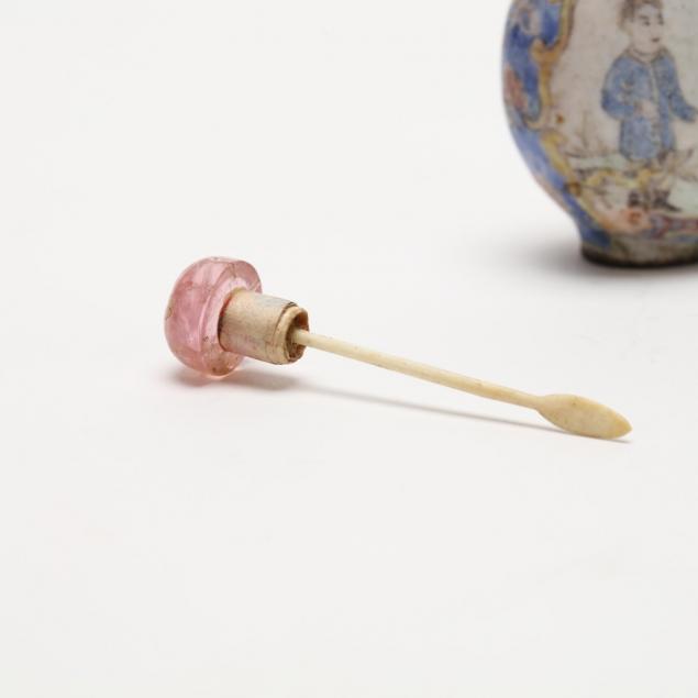Antique, a small bottle hand painted with European styled figures on both sides of the bottle within medallions bordered by yellow and blue floral patterning, stopper has a pink glass top.