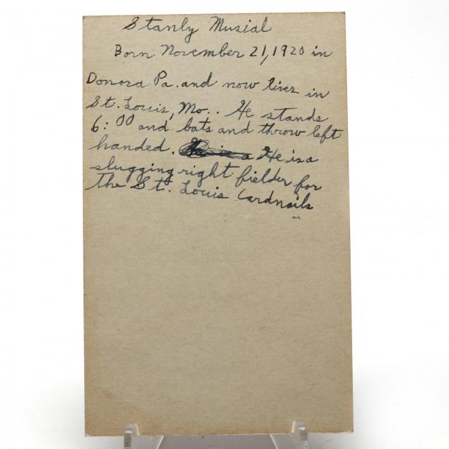 Circa 1940s-1950s, players include Stan Musial and Enos Slaughter, 12 cards inscribed by collector with biographical information.