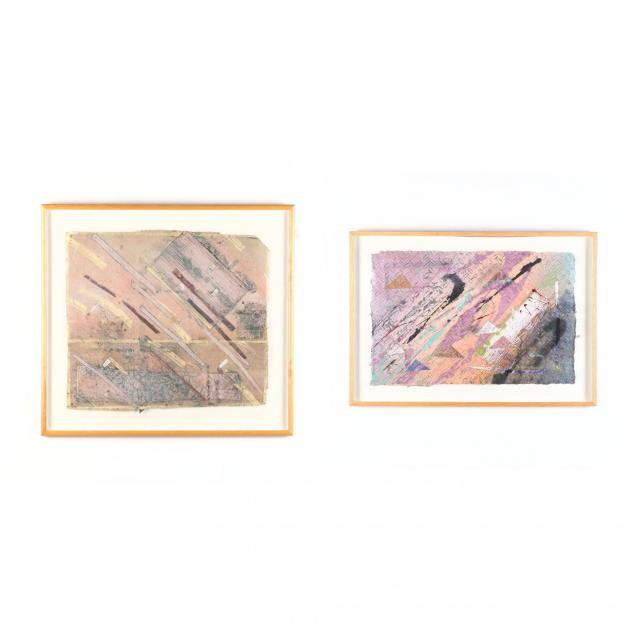 Paint and pastel on embossed handmade paper, 20th century, presented in wooden floater frames with linen backing.