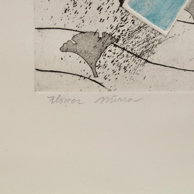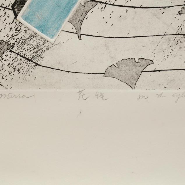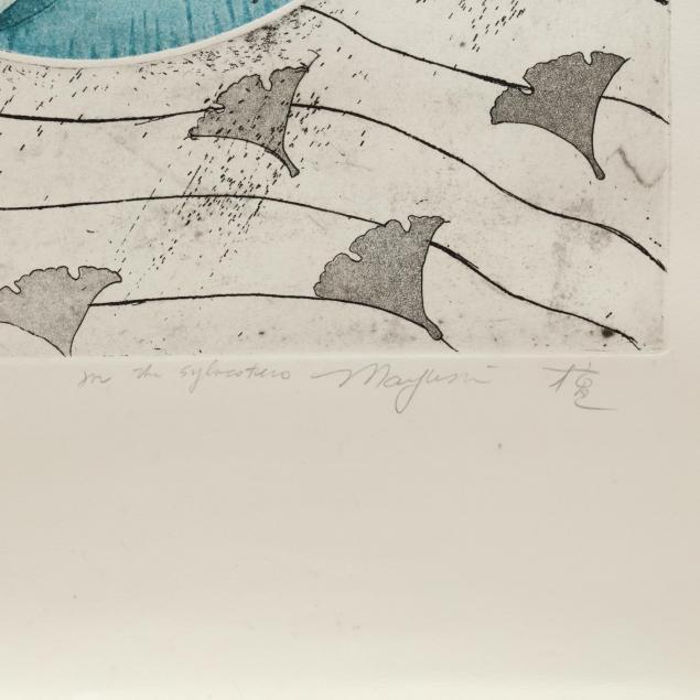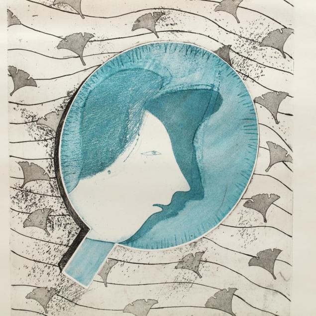 Signed "Flower Mirror" in pencil in English and in Japanese characters along the bottom of the print, woodblock print, ink and colors on paper, image of a girl in a mirror with gingko leaves surrounding the central image, printed on thick paper, Mayumi has been called the "Japanese Matisse" for her style with bold colors and organic shapes.