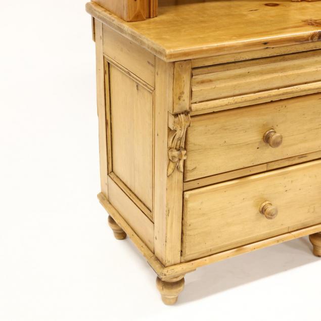 Pine, two part form, 20th century upper step back cupboard, with applied turned columns, molded shelves, and four drawers, over a 19th century base having a central molded drawer with divided interior over a paneled door, flanked by six drawers, raised on turned legs.