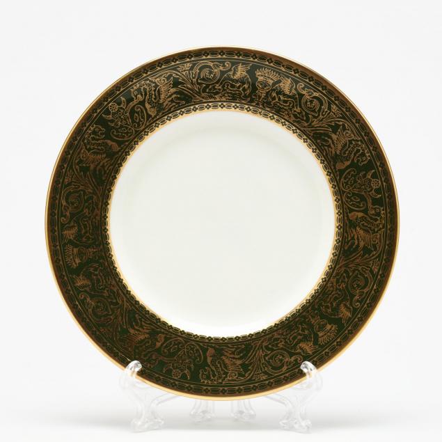 20th century, dark green rim with gilt accents, #W4170, to include (8) bread plates, (8) salad plates, (8) dinner plates, (8) teacups, (8) tea saucers, (2) espresso cups, and (2) espresso saucers, all marked.