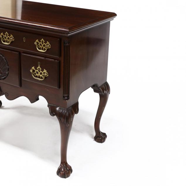 Mid 20th century, mahogany, top with molded edge, two over three drawers featuring relief carved shell, scalloped skirt, flanked by fluted columns, on cabriole legs with shell knee and ball and claw foot, labeled.