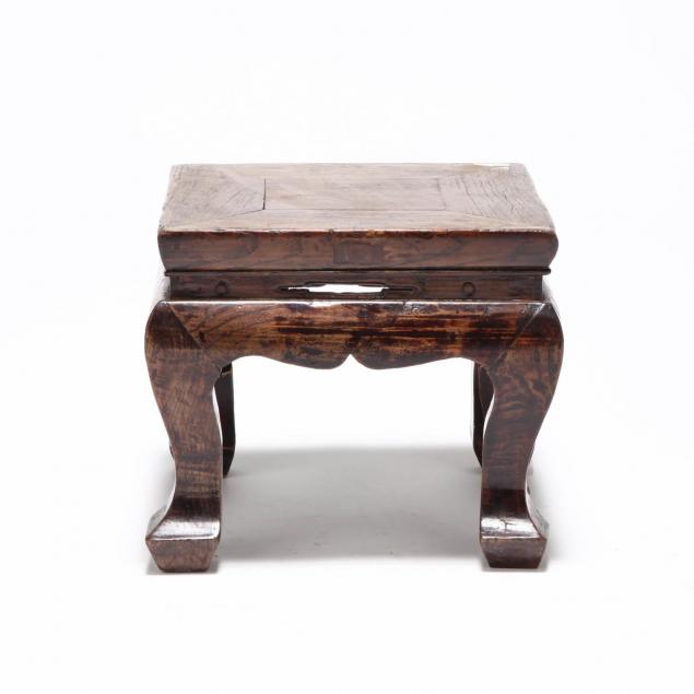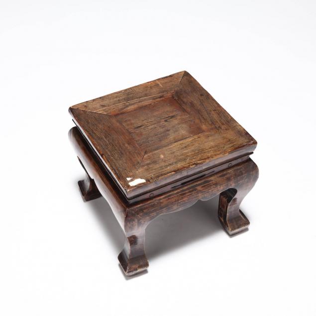 19th century, hardwood, square banded top with pierced and scalloped skirt, cabriole legs.
