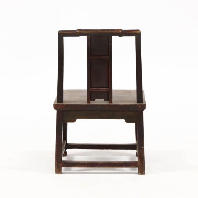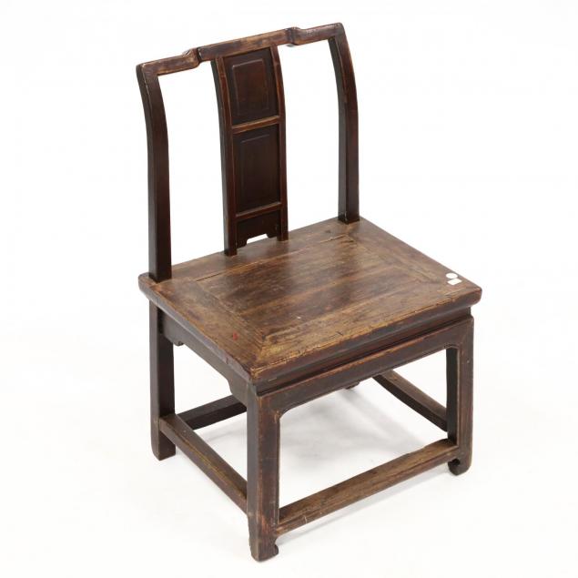 19th century, hardwood, stepped crest rail, paneled and curved back splat, plank seat, molded legs with stretcher.