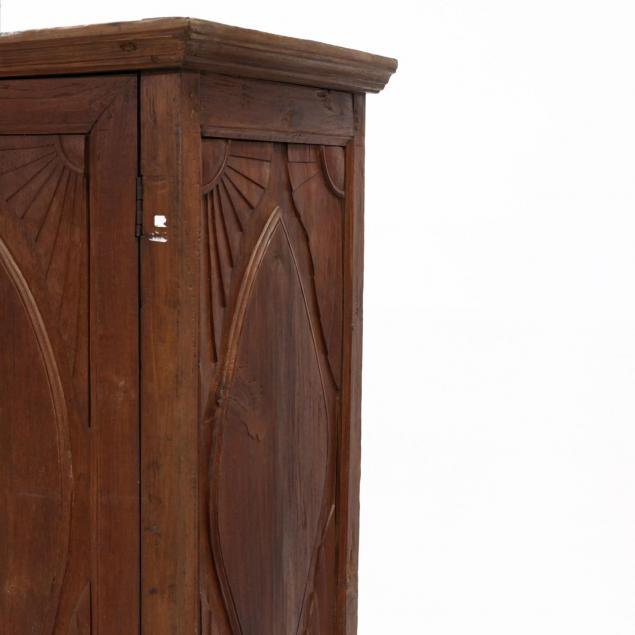 19th century, one part form, hardwood, applied molded cornice, two hinged panel doors with sunburst and lozenge carvings, shelved interior, over two paneled drawers, raised on square tapered legs on block foot.