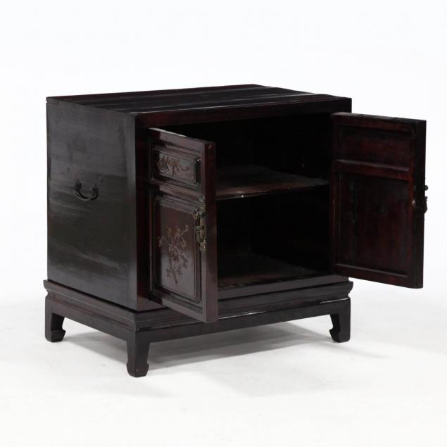20th century, two part form, through tenon construction, with relief carved paneled hinged doors, gilt highlights, shelved interior, raised on stylized scrolled legs.