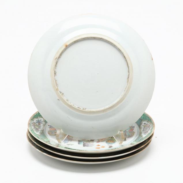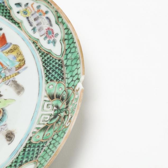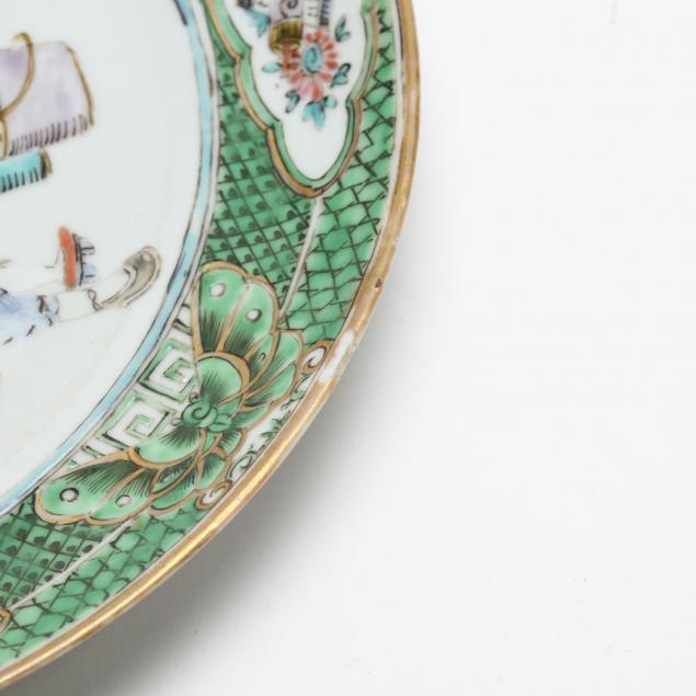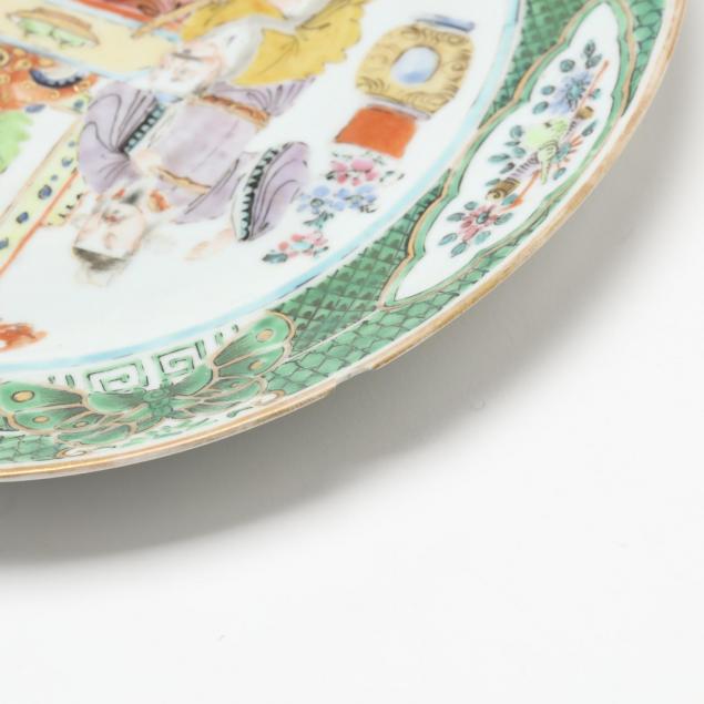 Circa 1900 in the Kangxi style, the center painted in enamels with an interior scene featuring multiple figures surrounding a seated scholar, unmarked.