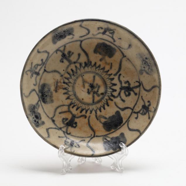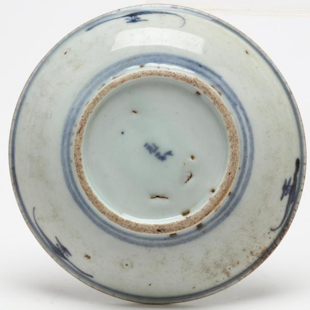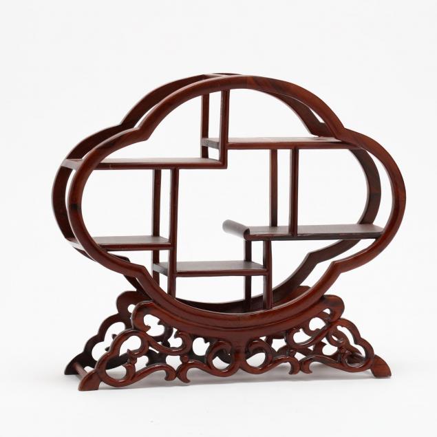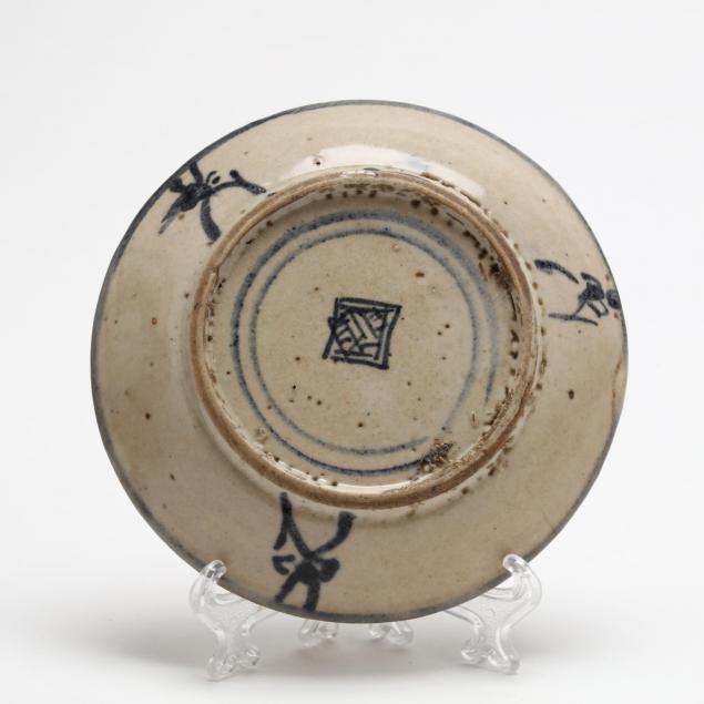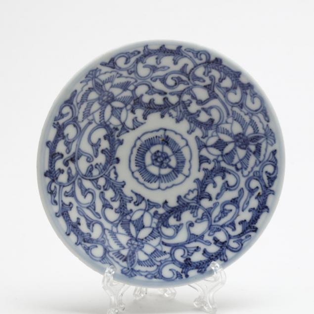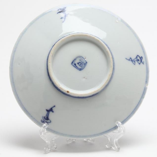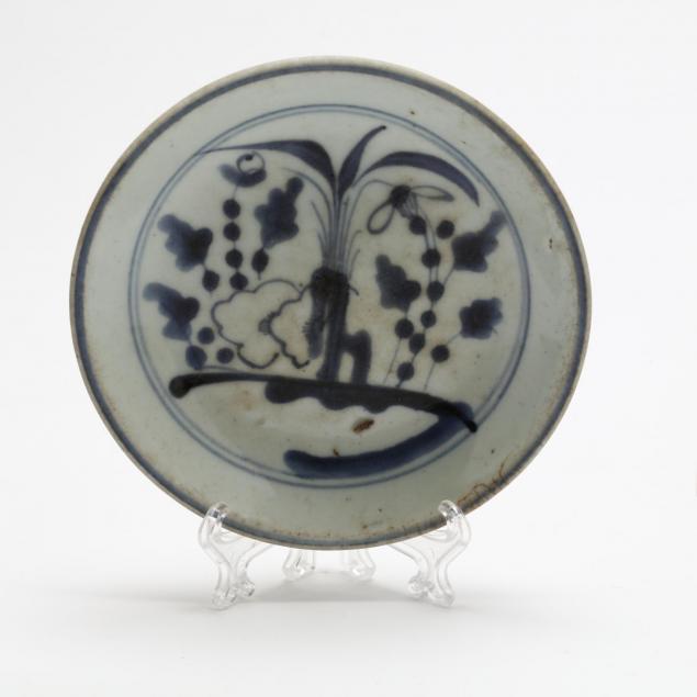 Including a hardwood display stand (9.5 x 10.75 x 3 in.); three blue & white dishes; and a brass silk iron.