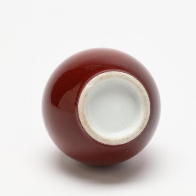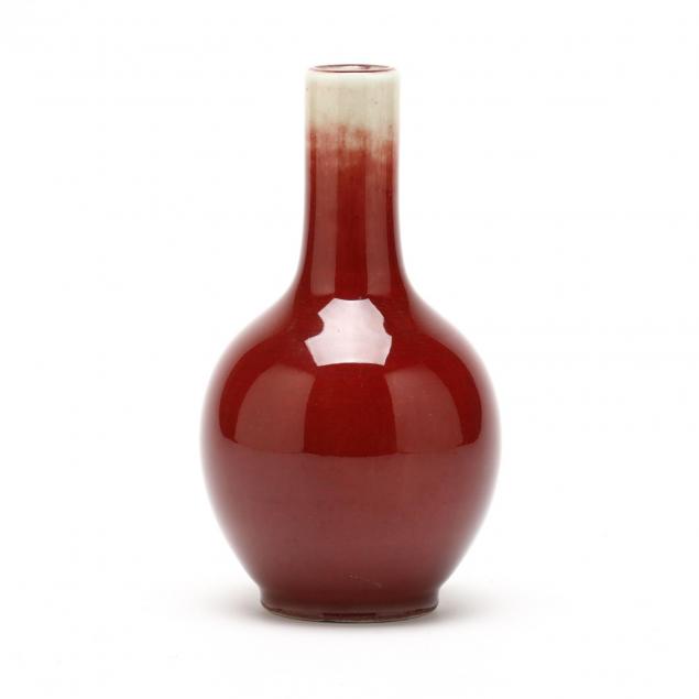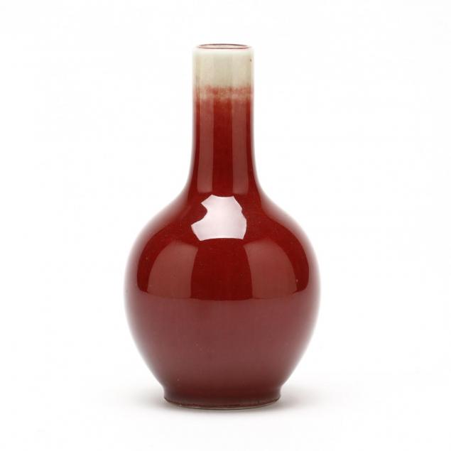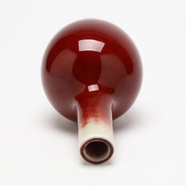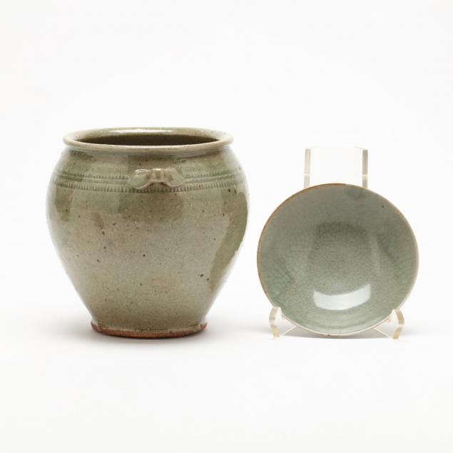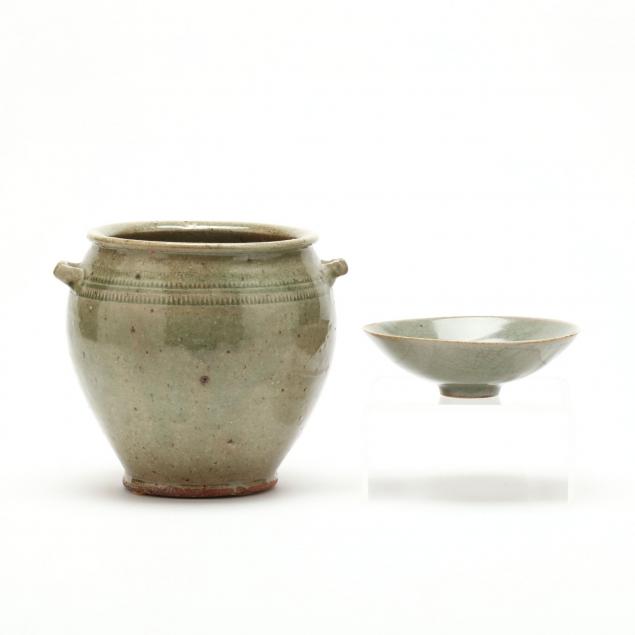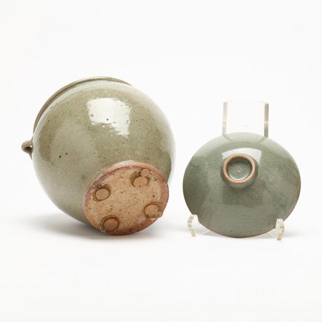 Includes a flambe red bud vase, an elegant low bowl with very good celadon green crackle and a small foot, and a celadon green open mouth jar with two lug handles and rough foot.