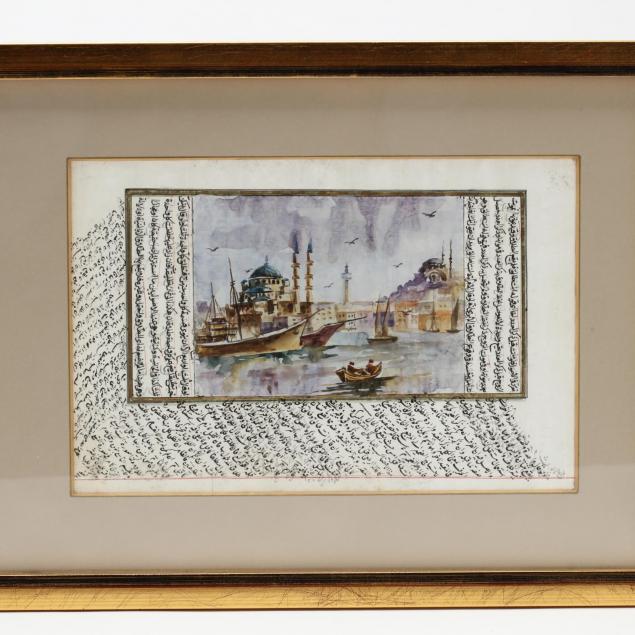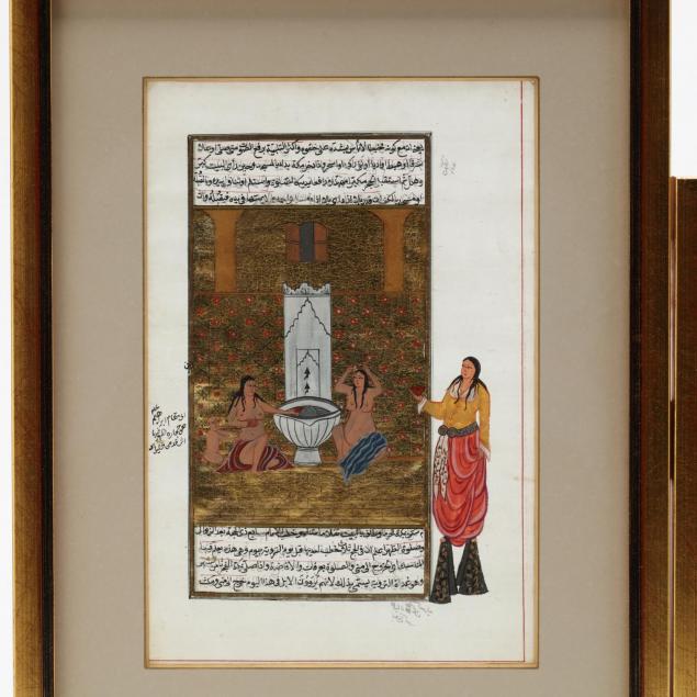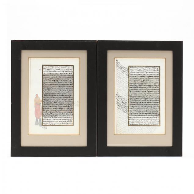 Includes two framed under glass pages from an Indian book with script on both sides and one with painting using gold leaf on one side and the other with a watercolor painting of mosques, framed with double sided glass so you can see front and back of the pages, not examined outside of the frame.