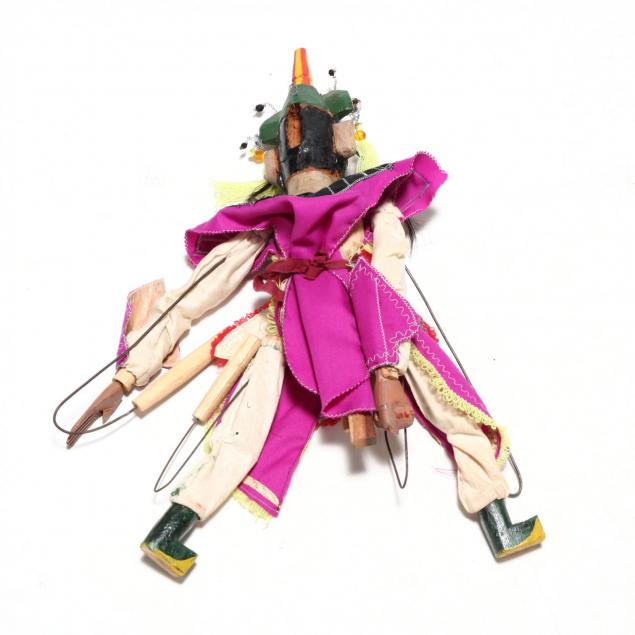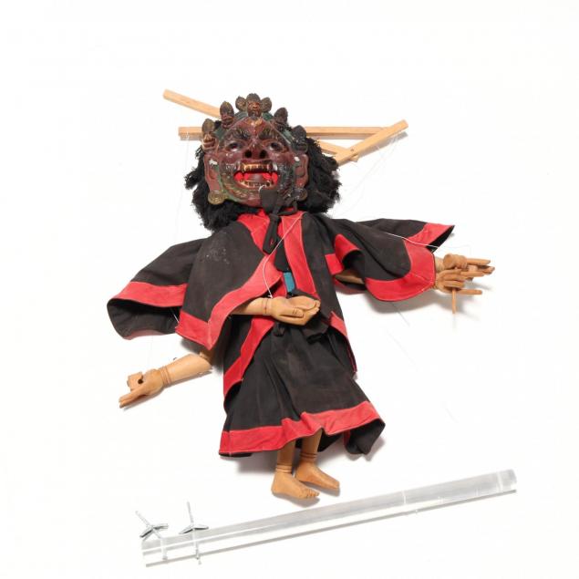 To include large deity puppet, carved and painted wood face with wood arms and feet; an Indian puppet of a snake charmer (strings broken); carved and painted puppet of a man; and a painted puppet of a woman in a floral dress.