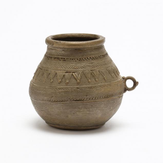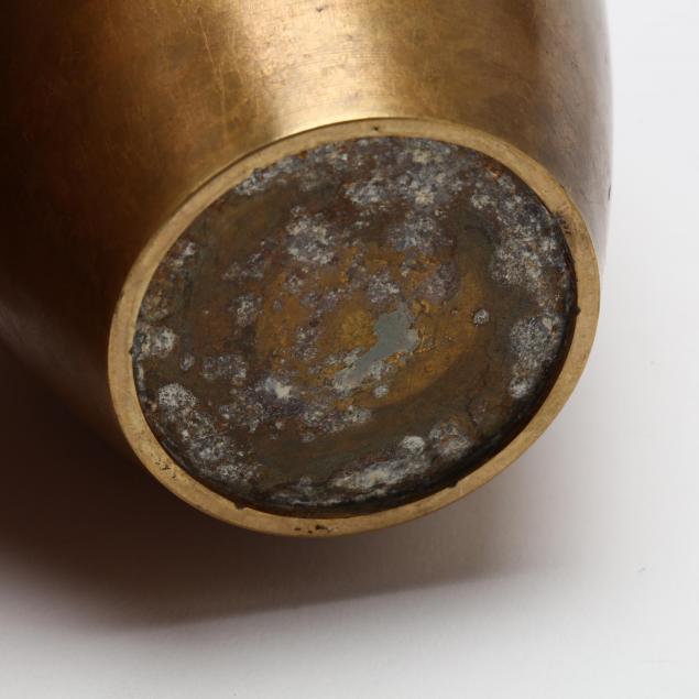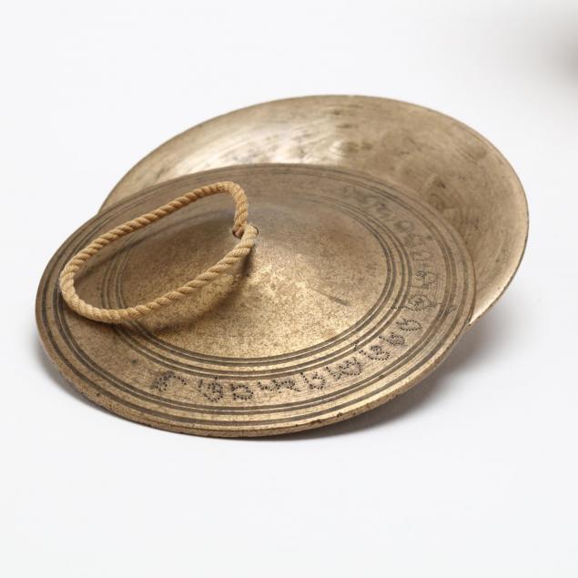 Late 19th or 20th century, to include two small vases, a small relief pot, and a pair of cymbals.