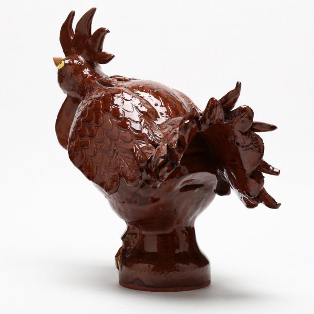 Brown glazed earthenware rooster with allover inscribed feather detail, modeled standing on a circular plinth, potter's stamp on the front of the plinth.