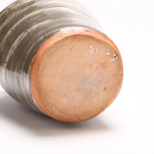 Gray and white swirl clay, ovoid stoneware, glass glaze, the first has double handles with sine waves through the handles (12.75 in.); the second is baluster in form, has four handles, also a sine wave band (16.5 in.) (area of break and repair from the rim to the throat; two firing lines), stamped on the bottom.