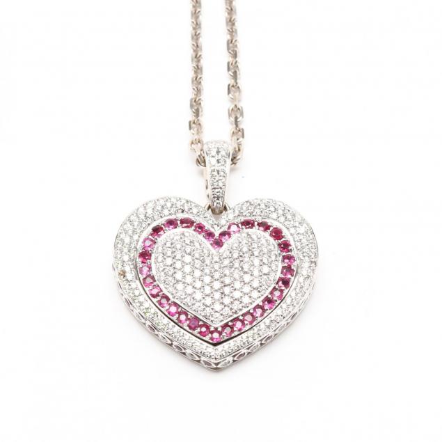 The heart form pendant with a pavé set diamond field center heart outlined with bead set round brilliant cut rubies and further outlined in a conforming border of bead set round brilliant cut diamonds, pendant sides alternating with heart set ruby and diamond accents, with diamond set bail and testing 14KT, suspended from an oval link chain stamped 14KT / Turkey. Total approximate weight of the (47) rubies approximately 1.88 carats; total approximate weight of the (256) round brilliant cut diamonds approximately 4.58 carats (H-I color, VS2 clarity-SI1 clarity).