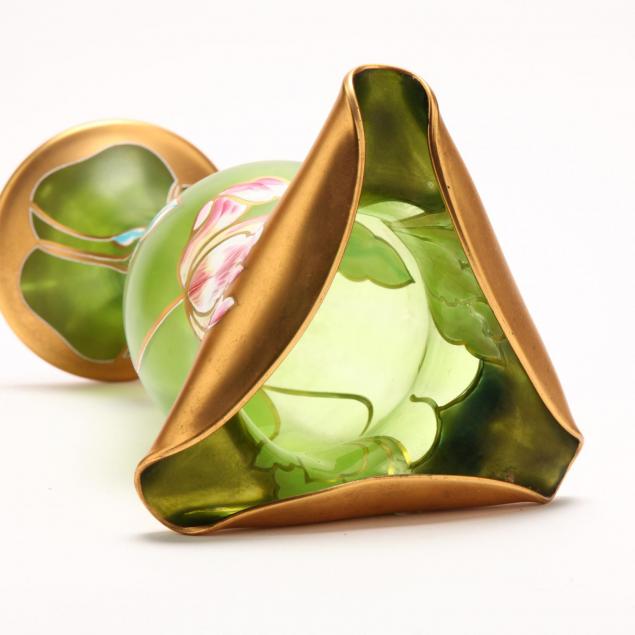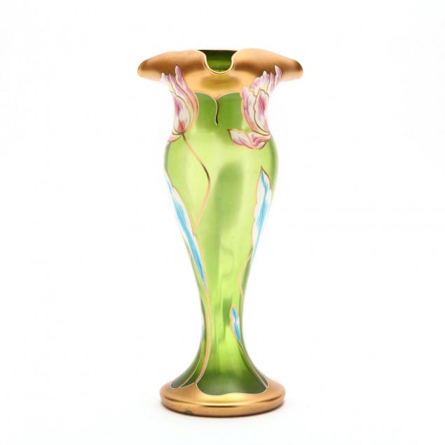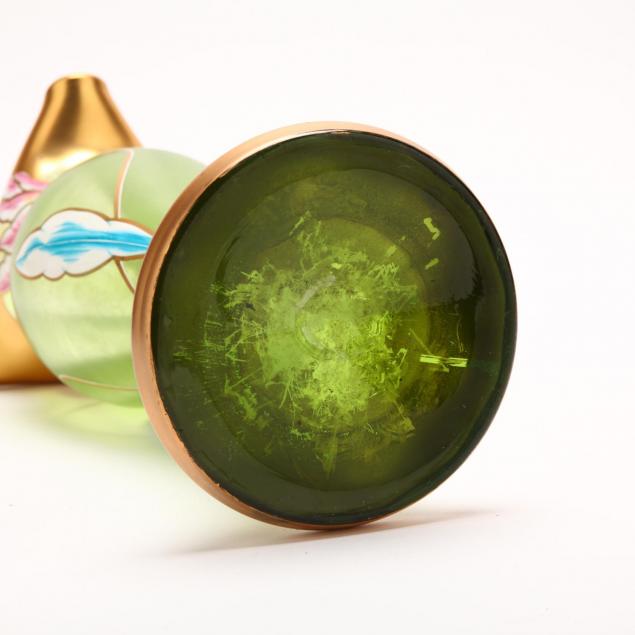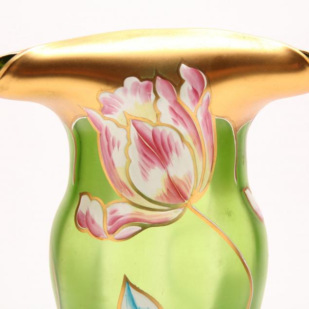 Circa 1910, green glass with painted enamel decoration of tulips with gilt highlights, unmarked.
