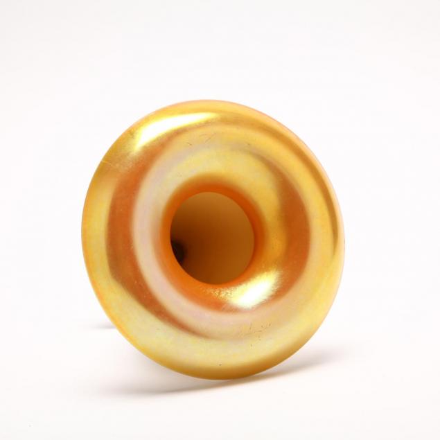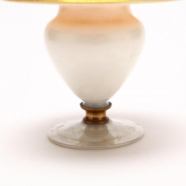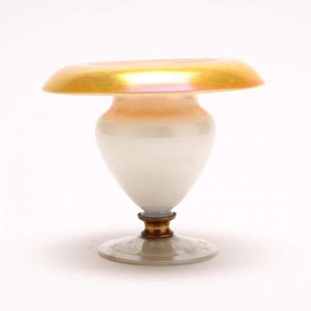 Early 20th century, blown glass in two parts with gilt metal mount on stem, interior of flared rim bowl with attractive gold iridescence, polished pontil, unmarked.