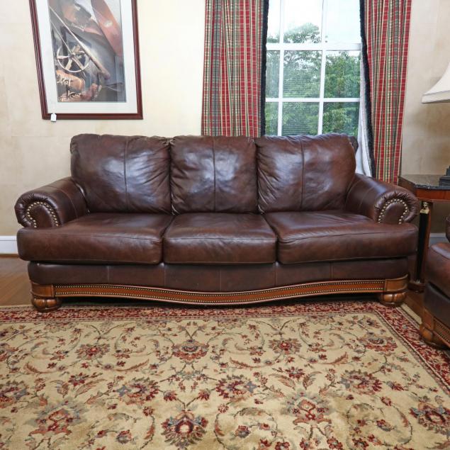 Brown leather, three cushions, brass tack trim, with drop skirt, on suppressed bun foot.