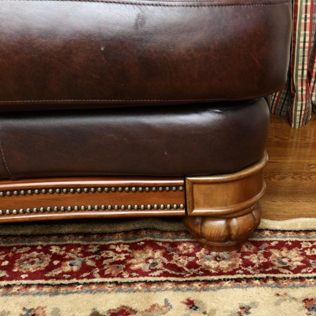 Brown leather, three cushions, brass tack trim, with drop skirt, on suppressed bun foot.