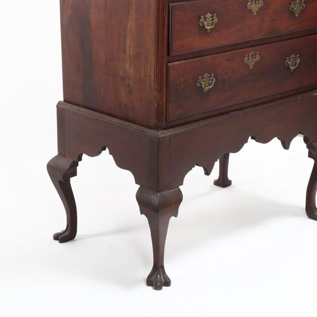 Circa 1770, poplar and white pine secondary, later applied cove molded cornice to the dovetailed case, three upper side by side lipped drawers above four graduated lipped long drawers, on a later but appropriate styled frame with a scalloped skirt, cabriole legs and trifid feet.