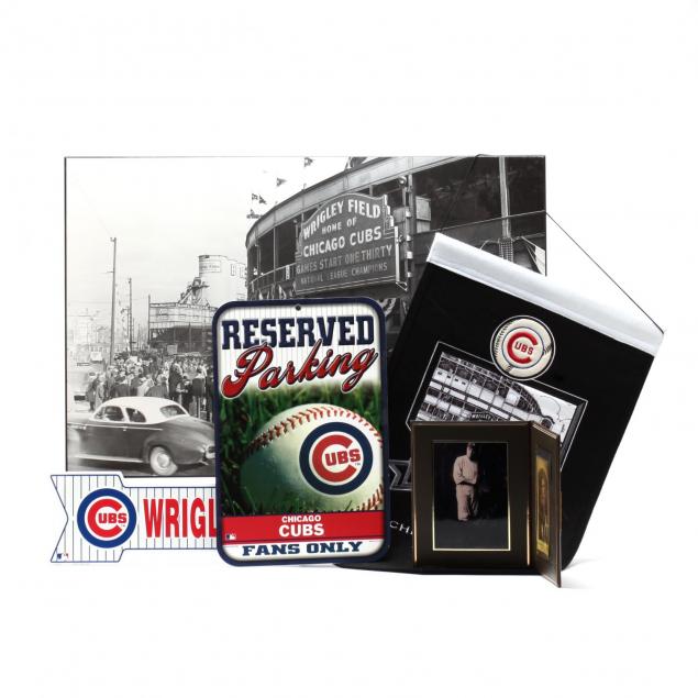 Contemporary, to include a decorative print of a photo of Wrigley Field; decorative tin sign; a Chicago Cubs fan parking sign; a woven pennant; a Babe Ruth poster and a commemorative Babe Ruth photo and card from the National Baseball Hall of Fame.