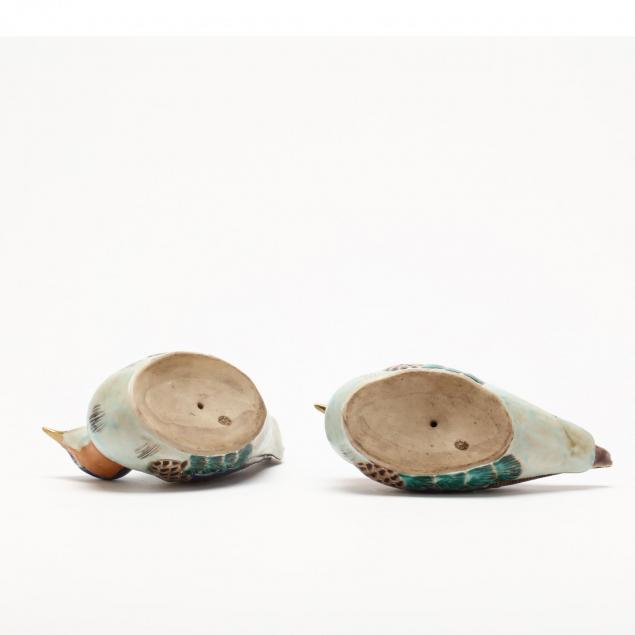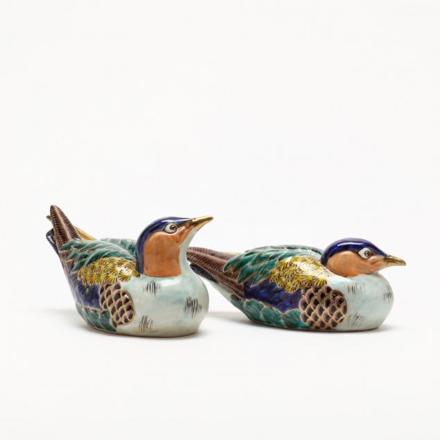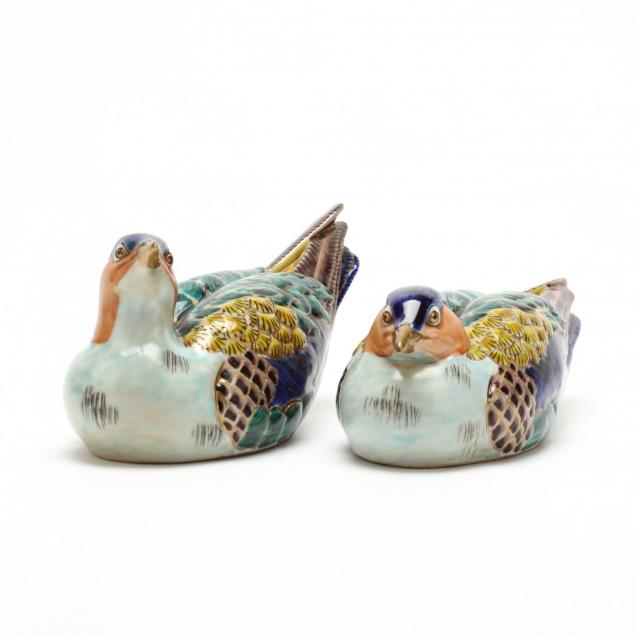Late 19th century or early 20th century, impressed mark on underside, porcelain birds vividly painted in polychrome palette with added touches of gilt on feathers, beak, and eyes, pairs of birds symbolize marriage fertility and harmony in Asian culture.