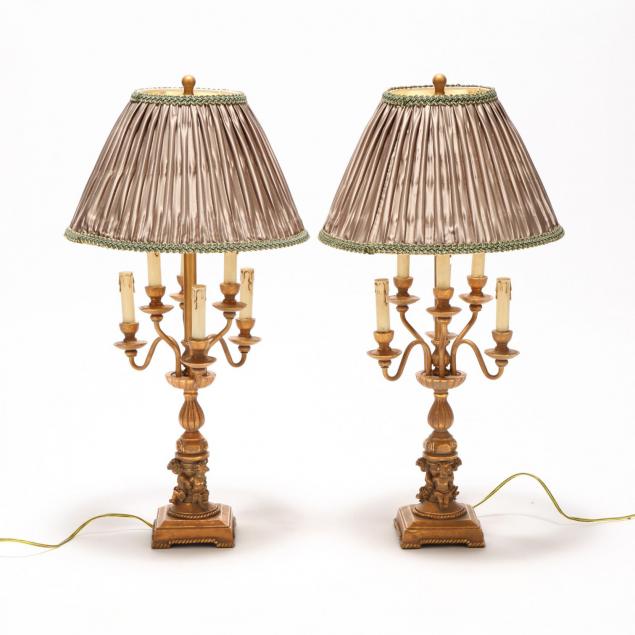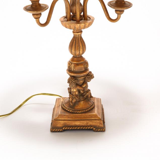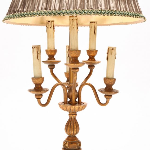 Late 20th century, composition with gilt antiqued finish, in the form of a six light candelabra and having single electrified light source, pleated and gilt shades, marked Berman.