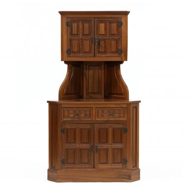 Mid 20th century, two part form, mahogany, with raised panel chip carved doors with two drawers with repeating pattern, raised on a flush base.