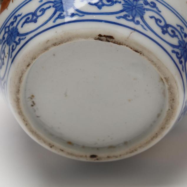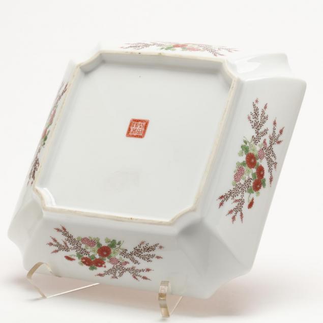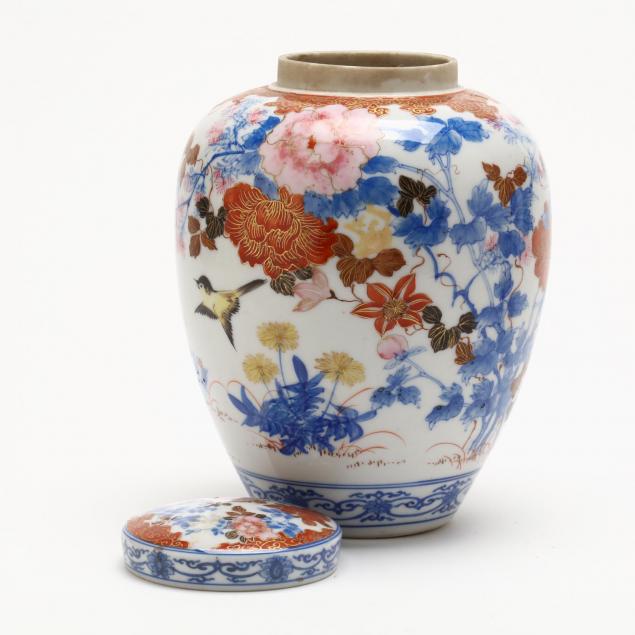 20th century, includes a square dish with dimpled corners, decorated in the center with a pair of pheasants under flowering trees and bushes, surrounded by a border in iron red with gilt floral decoration, and a covered jar decorated with a pair of birds flying amid a myriad of flowers in iron red, blue, pink, and yellow enamels and added touches of gilt.