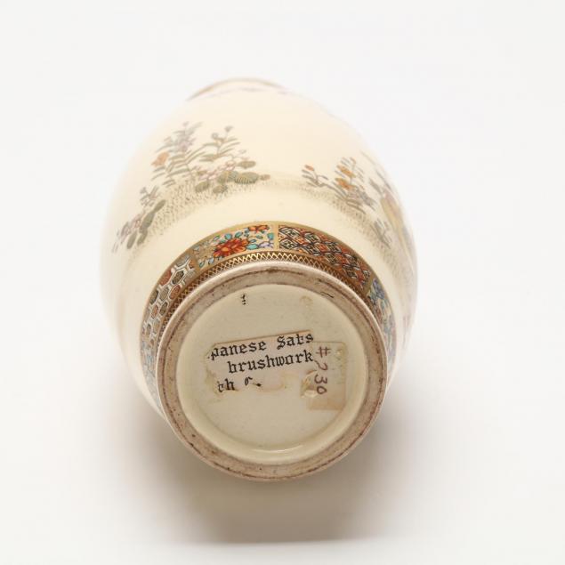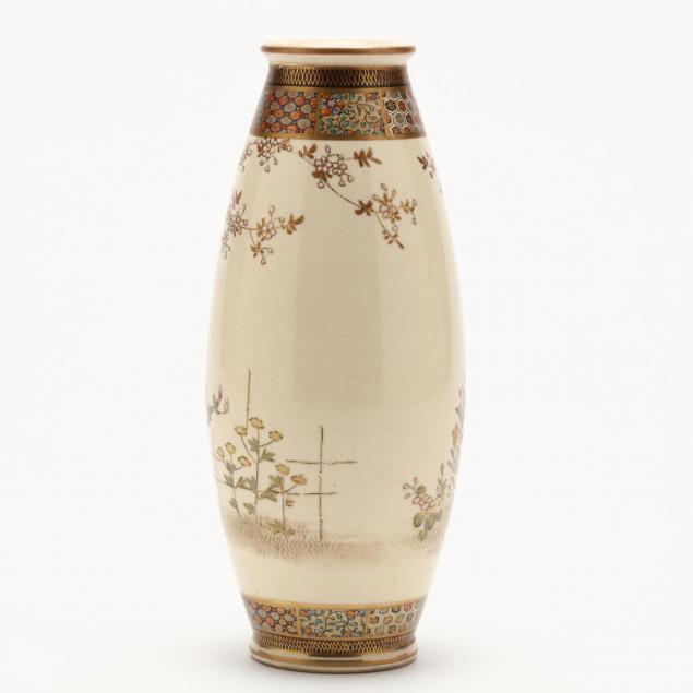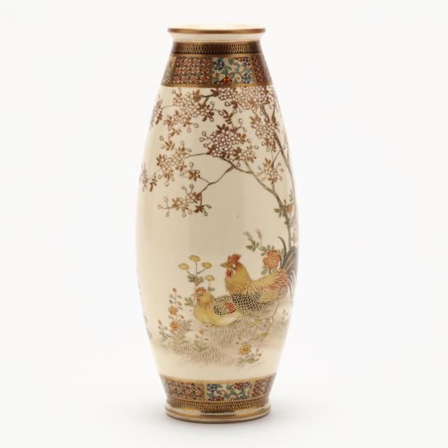 Late 19th century, finely crackled ivory ground color decorated with meticulous detail with a rooster and a chicken under plum blossom trees, bands above and below with ornate kimono patterns very finely painted, gilt highlights applied to all of vase.