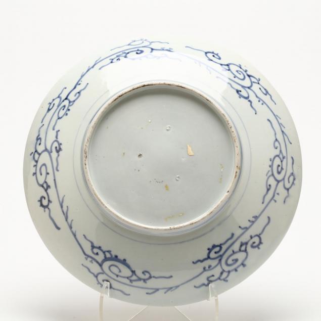 19th century, enameled with a playful foo lion, within panels of red and blue foliage around the rim, painted around the exterior splashes of meandering tendrils, with three kiln spur marks on underside.