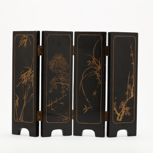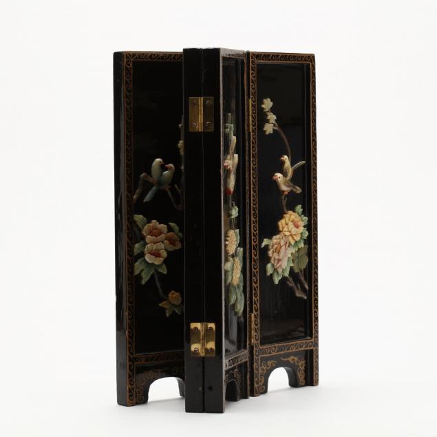 20th century, a black lacquer screen with applied carved hard stone decoration of pairs of birds with flowers, border with gilt decoration, reverse side with flowers and trees painted with gilt.