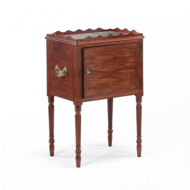 Possibly Massachusetts, early 19th century, mahogany, mahogany veneer, white pine secondary, inset rectangular marble top, with an applied scalloped gallery, top with molded edge, single hinged door, with double line inlay and banded border, cock beaded edge, open interior for pitcher and bowl, upper stiles inlaid with crotch veneers and double line light and dark wood line inlays, raised on tapered reeded turned legs, sides with applied brass handles.
