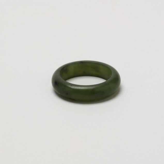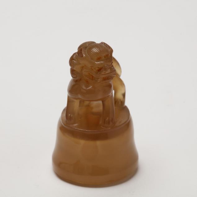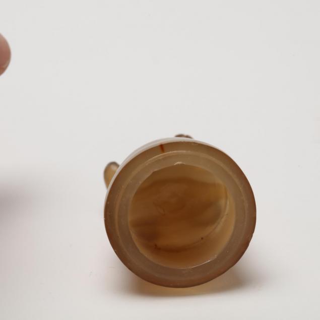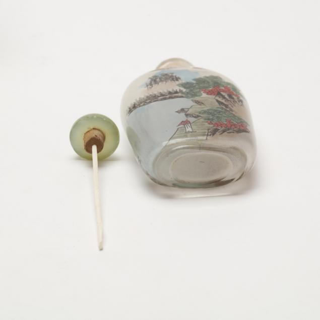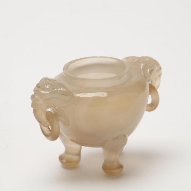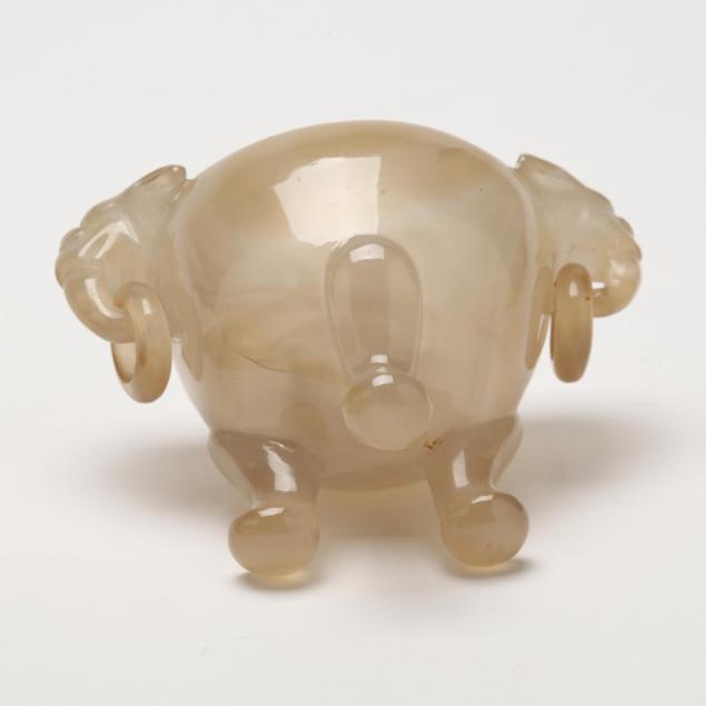 Includes a small tan hard stone urn with elephant handles holding rings, raised on three legs, with foo lion topped cover, comes together with small carved wooden stand, a snuff bottle decorated in reverse glass painting with a mountainous lake landscape on either side, and a spinach jade ring.