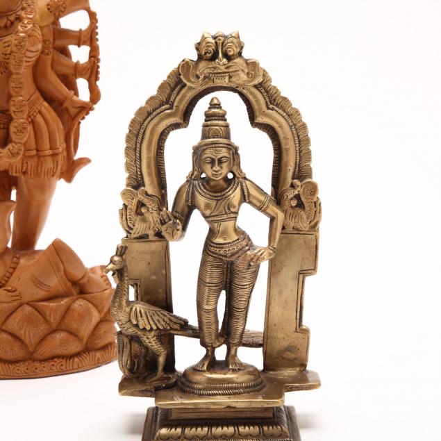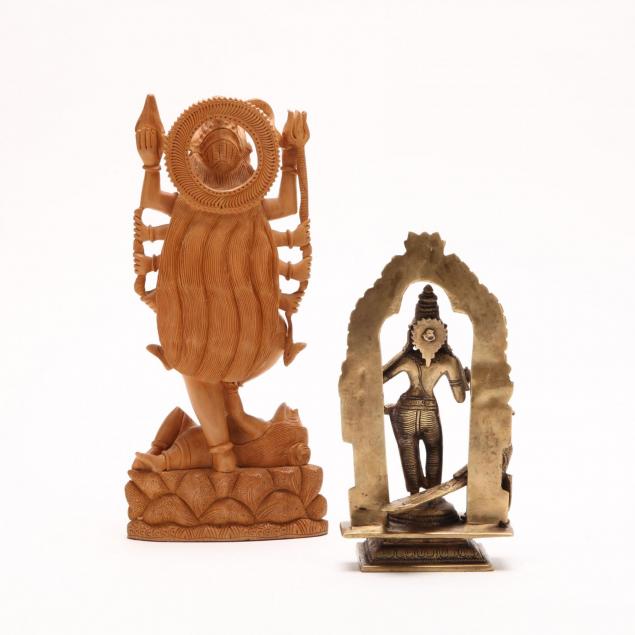 20th century, to include a wooden carved Kali and a cast brass Shiva and Parvati figure.