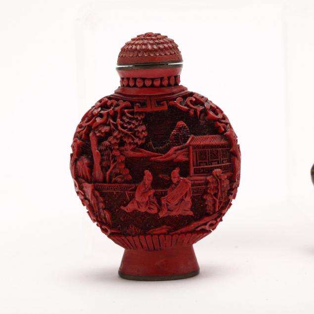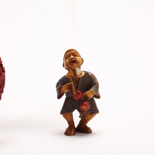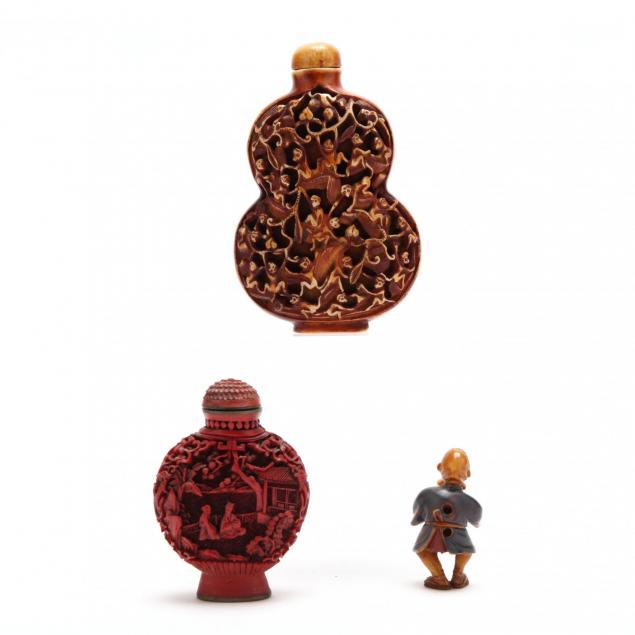 20th century, to include two carved composite snuff bottles and a small figure of a man.
