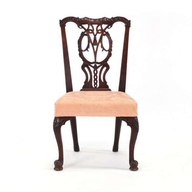 Late 18th century, shaped crest with relief carving, pierced ornate back splat with central tassel, over upholstered seat, cabriole legs with relief carved knee on stylized whorl foot.