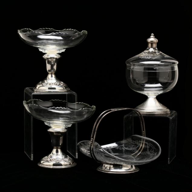 Including a Hawkes sterling silver and etched glass basket, signed, no monogram (2.5 troy oz.); a lidded glass candy jar with sterling base (7.25 in.); and a pair of pattern glass compotes with convertible candlestick sterling silver bases.