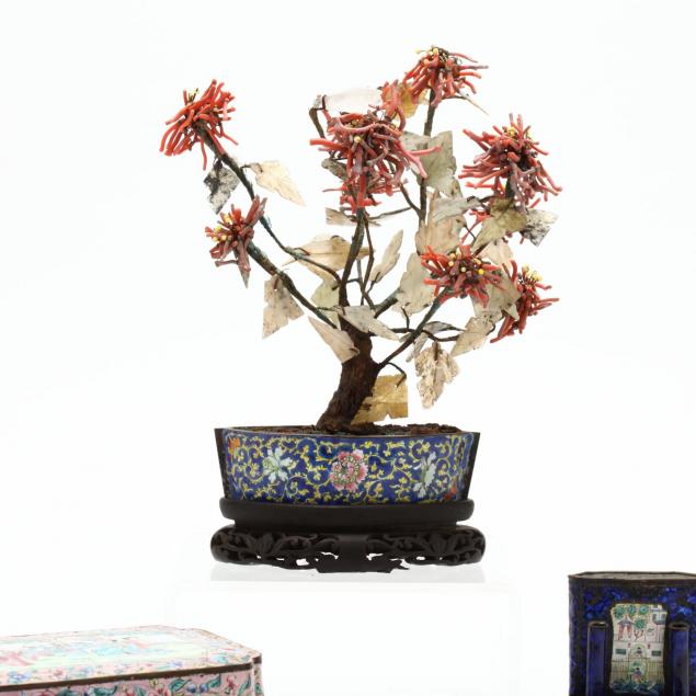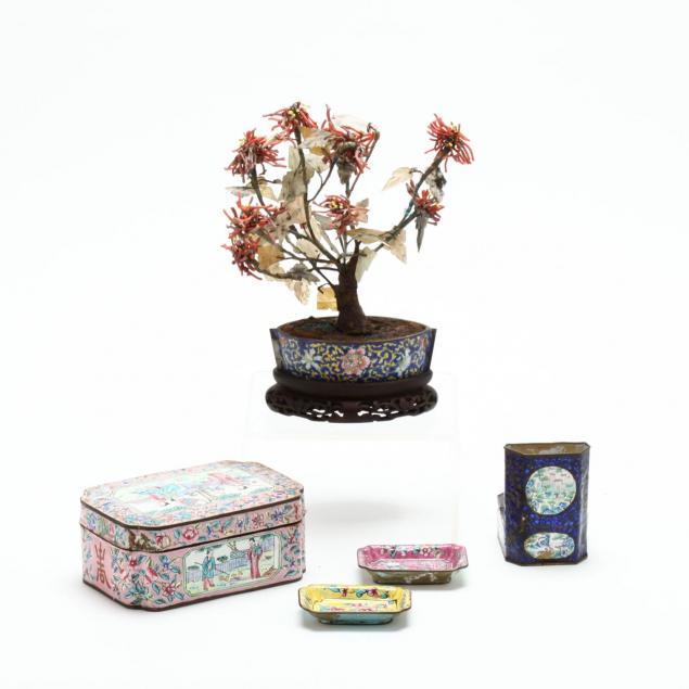 The first a table box with pink ground (2.75 x 6 x 4 1/8 in.); a desk stand with cobalt ground; (2) small dishes; and a miniature hardstone and coral tree with enameled base.