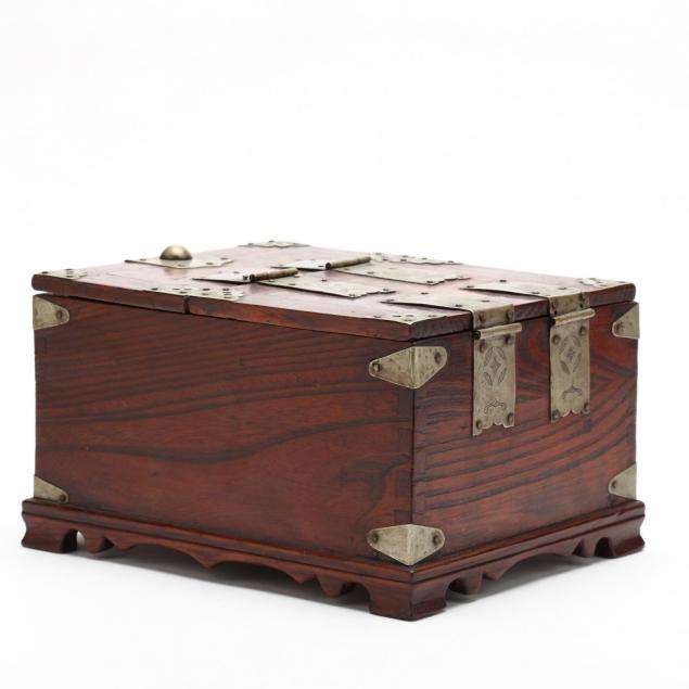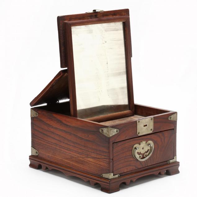 Antique, with adjustable interior mirror, one drawer with brass bat hardware, brass hardware over top, on four raised feet.