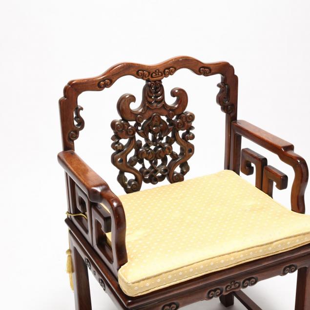 20th century, a very finely carved chair with ornate back with auspicious decorations of a bat, peaches, Chinese shaped clouds, and a longevity knot, the frame with elegant carved shape and offset key motif to arms, apron decorated with small Chinese clouds, a stepped stretcher at the bottom of the legs, comes together with a pale yellow patterned cushion.