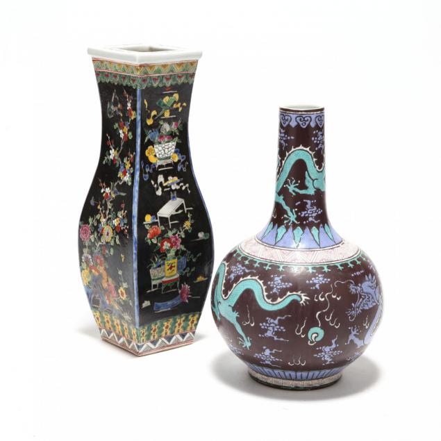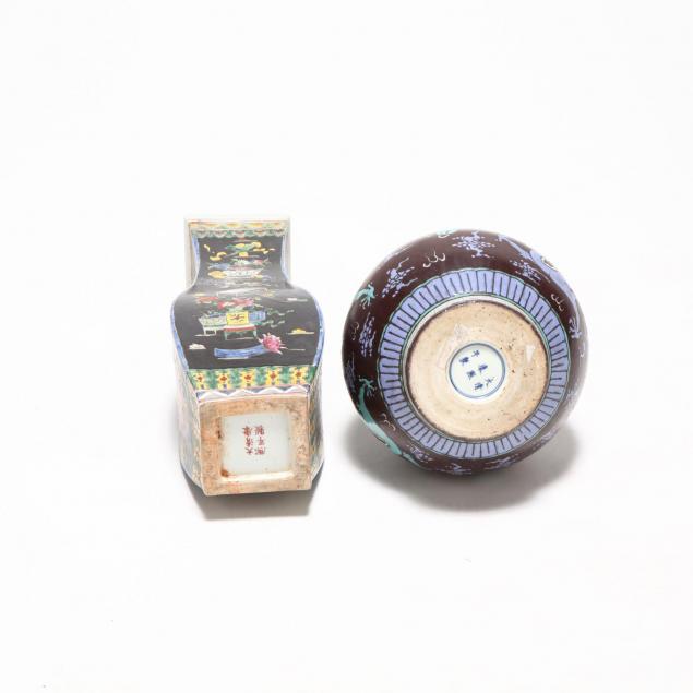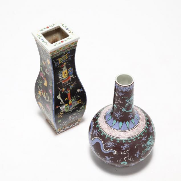 The first a bottle vase with brown gourd having blue dragon decoration to body and neck, six character mark to underside; the second with allover decoration of ducks in a pond on black ground, with repeating geometric bands to top and bottom rims, six character mark to underside.