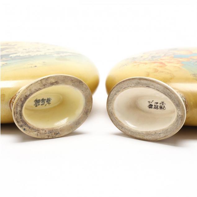 Early 20th century, front decoration of both vases depicting mountain landscape in fall, verso depicting pagoda and river scene in winter, ornate gilt accents to necks and feet of both vases, character marks to underside of both vases.
