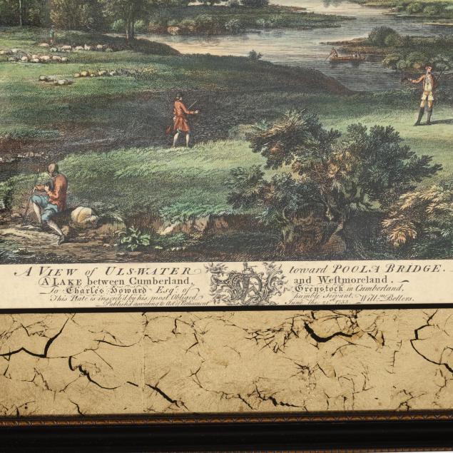 Hand-colored etching and engraving, likely 18th century with later hand coloring, to include "A View of Haws-water Lake near Banton in Westmoreland," "A View of Uls-water toward Poolabridge," "A View of Winandermeer near Ambleside," and "A View of the Head of Ulswater," matted and presented in uniform framing with gilt highlights.